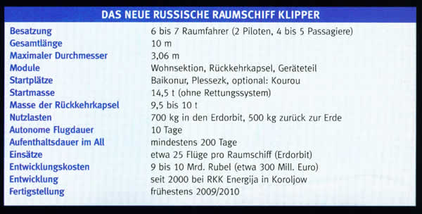 Wenn diese Zeitpläne eingehalten werden - erfahrungsgemäß wird das nicht der Fall sein, werden sich sogar Verzögerungen ergeben - werden die USA über mindestens 4 Jahre (2010 - 2014) KEIN Raumfahrzeug besitzen, mit dem sie Menschen ins All befördern können! Was man sich kaum vorstellen kann, aber so ist der aktuelle Stand. Der Austausch der ISS-Crews und deren Versorgung wird dann ausschließlich den Russen (Sojus, Progress) und Europäern (Ariane 5, Jules Verne-Transporter) obliegen. Vor diesem Hintergrund offenbarte der Chef von Rosaviakosmos, Juri Koptew, im Februar die Pläne für das Projekt "Klipper" auf einer Pressekonferenz. Bereits seit der Jahrtausendwende arbeitet der russische Raumfahrtkonzern RKK Energija an einer neuen Raumschiffsbaureihe, die für den Transport von bis zu sechs Personen ausgelegt wird. Das würde eine Verdoppelung der Kapazität der Sojus-Raumschiffe bedeuten, die seit 1967 ihren Dienst im All tun. Koptew behauptete sogar, in etwa fünf Jahren, also 2009/10, würde das neue Raumschiff einsatzreif sein. Damit ergäbe sich ein nahtloser Übergang zu der Lücke, die dann durch den Wegfall der US-Shuttles entstünde. In Fachkreisen schlug diese Meldung wie eine Bombe ein und Insidergerüchten zufolge soll G.W.B. "not amused" gewesen sein, dies zu hören. Schauen wir uns also das neue Raumschiff einmal etwas genauer an, denn es enthält einige sehr überraschende Momente für die Leser unserer Dokumentation "Der verlorene Traum":